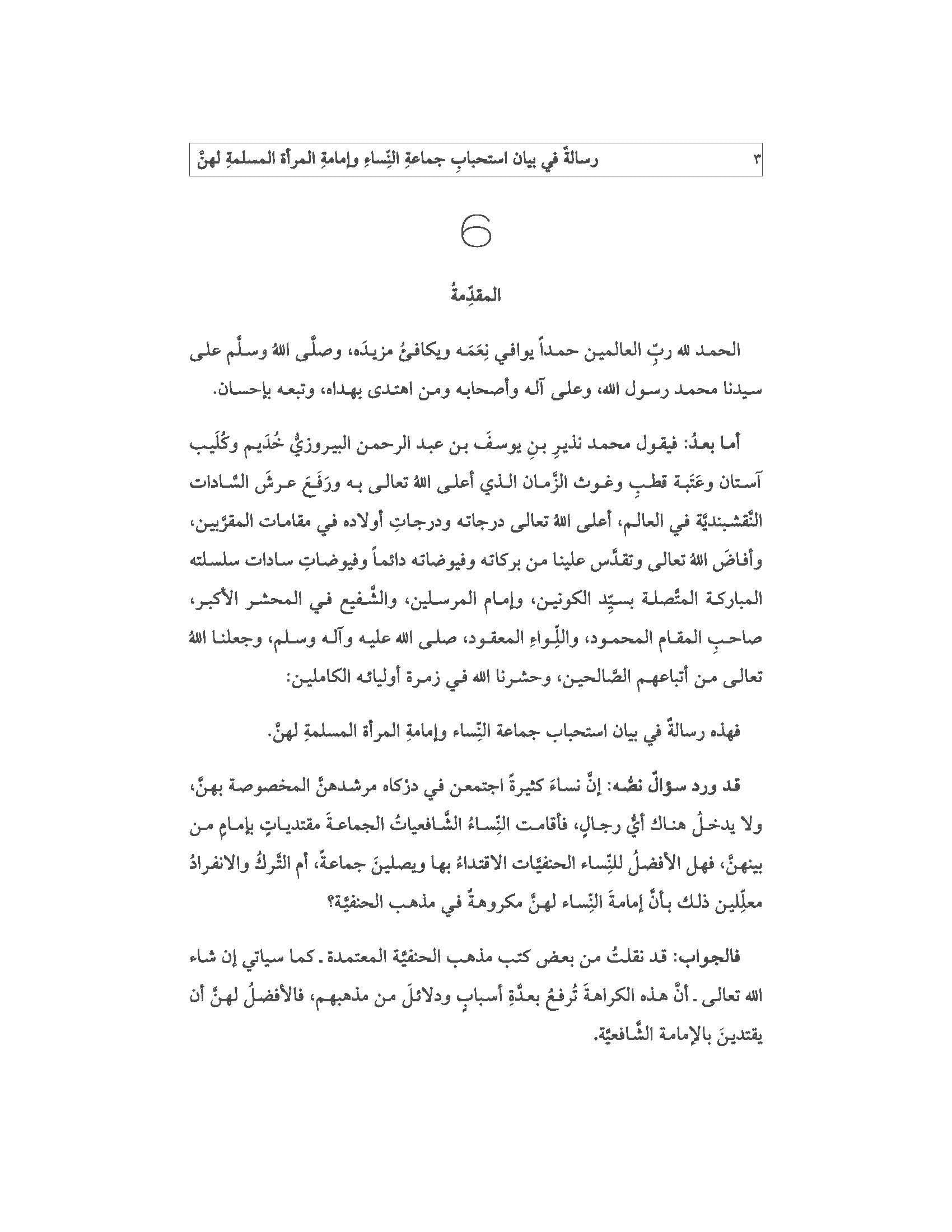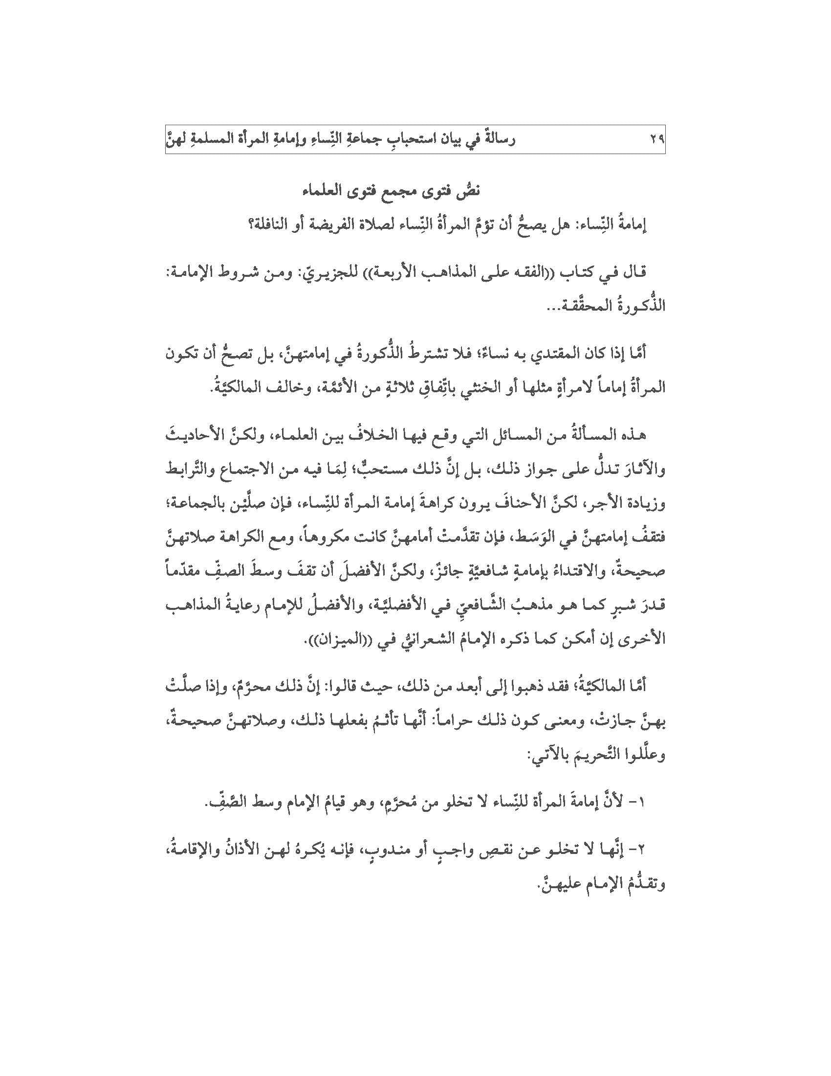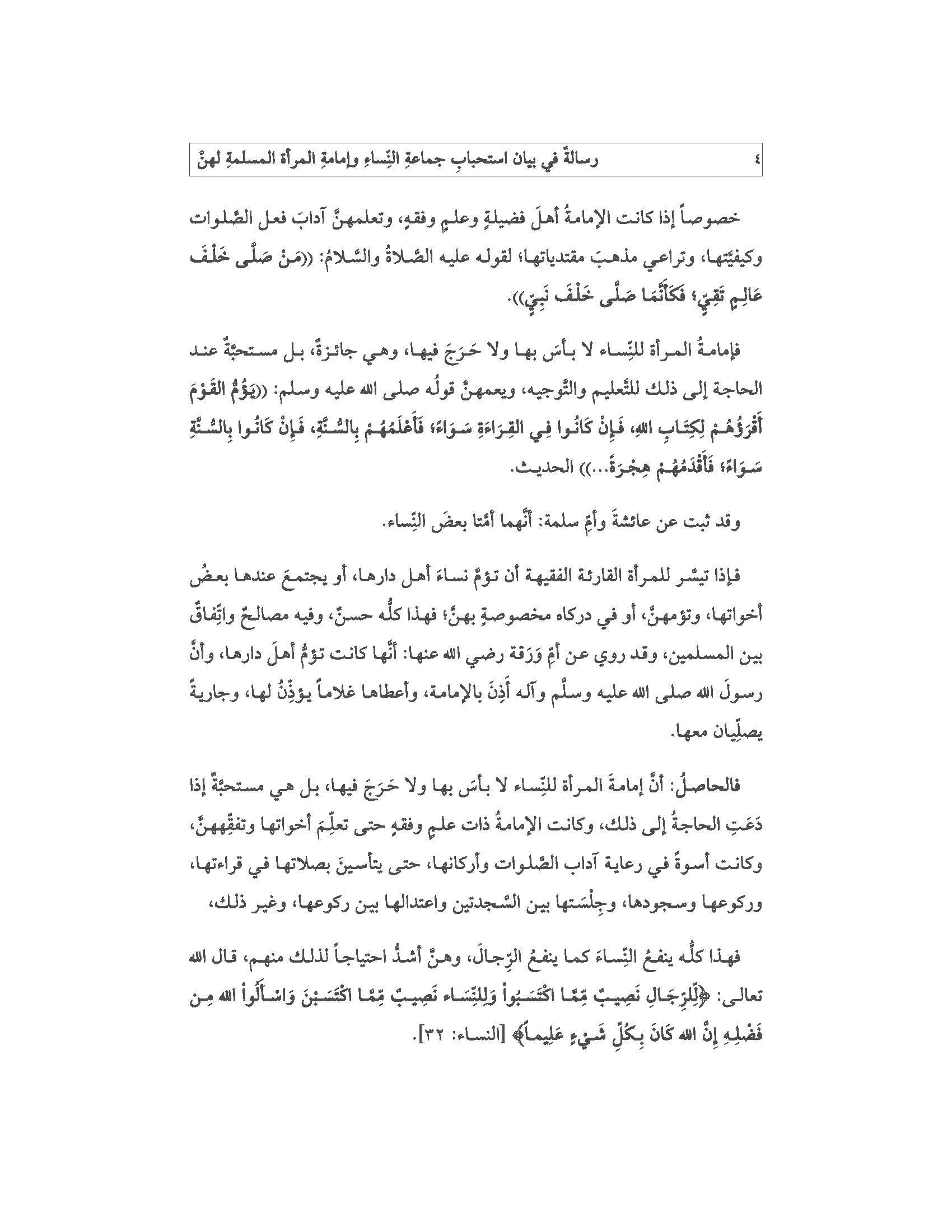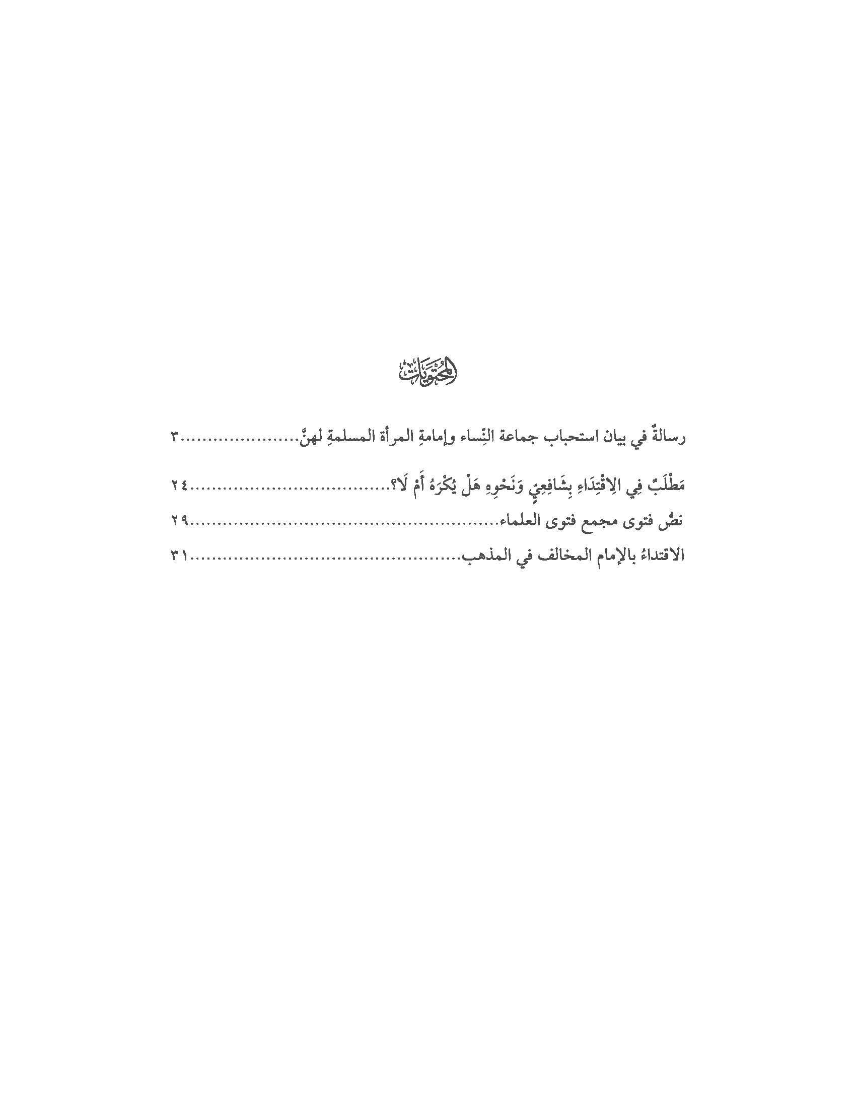 Bu eser, kadınların kendi aralarında cemaatle namaz kılmalarının hükmü ve bir kadının diğer kadınlara imamlık yapmasının caiz olup olmadığı konusunu ele alan fıkhî bir risaledir Müellif Muhammed Takiyüddin b. Yusuf ed-Dinûrî bu meselede delilleriyle birlikte sahih görüşleri ortaya koyarak kadınların özellikle dinî öğrenim süreçlerinde birbirlerine imam olmalarının meşruiyetini savunur Eser, bu konudaki farklı mezheplerin görüşlerini dengeli şekilde sunmakta ve uygulamadaki örneklere de yer vermektedir Modern dönemde kadınların cami dışında dinî ibadetlerdeki rolünün arttığı bir ortamda bu risale, kadınlara fıkhî bilinç kazandırmakta ve cemaatle ibadetin faziletini hatırlatmaktadır Kitap açık ve sade bir dille yazılmış olup hem bireysel okumalar hem de ders halkalarında kullanılmaya uygundur