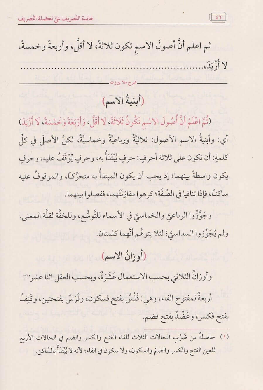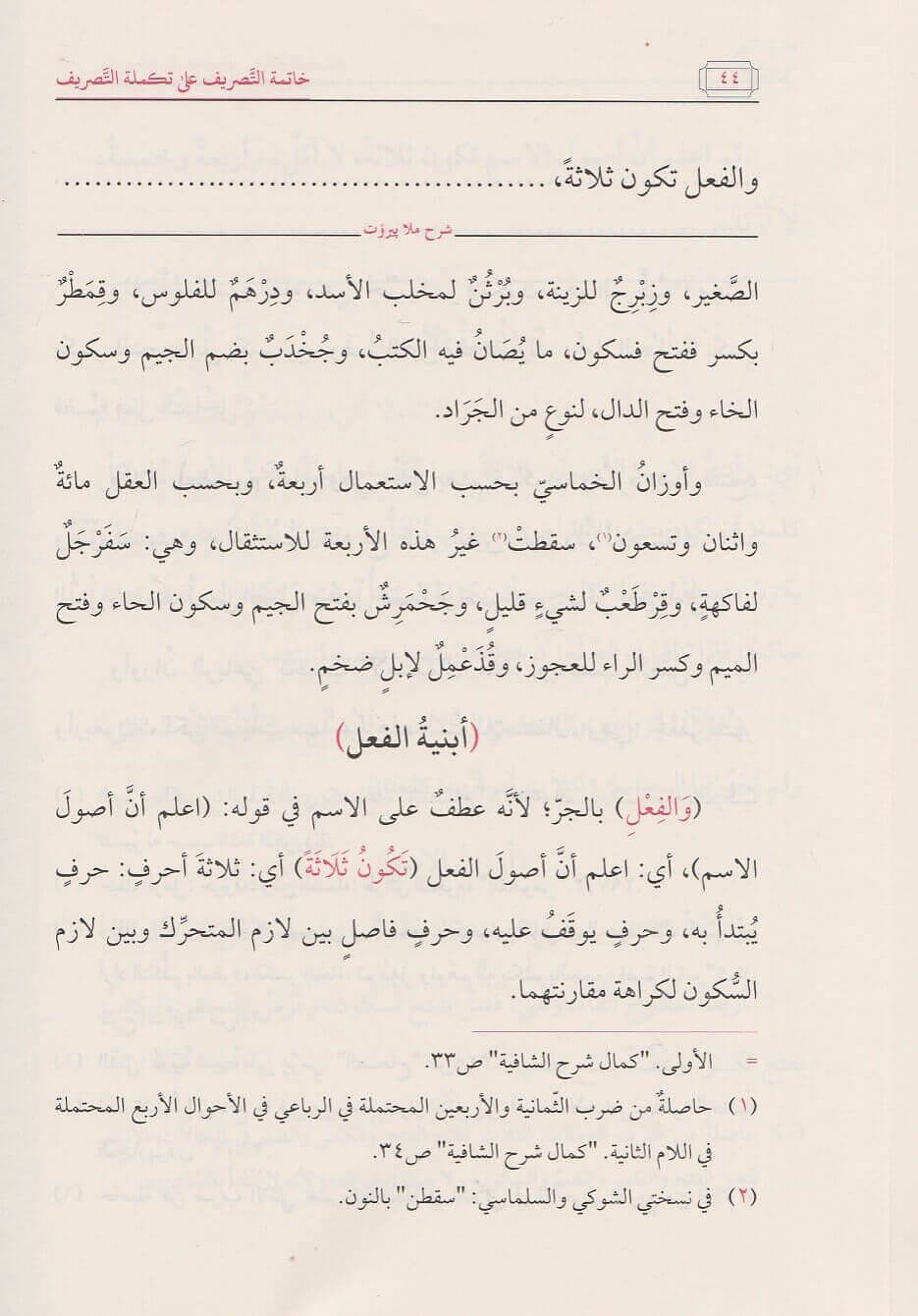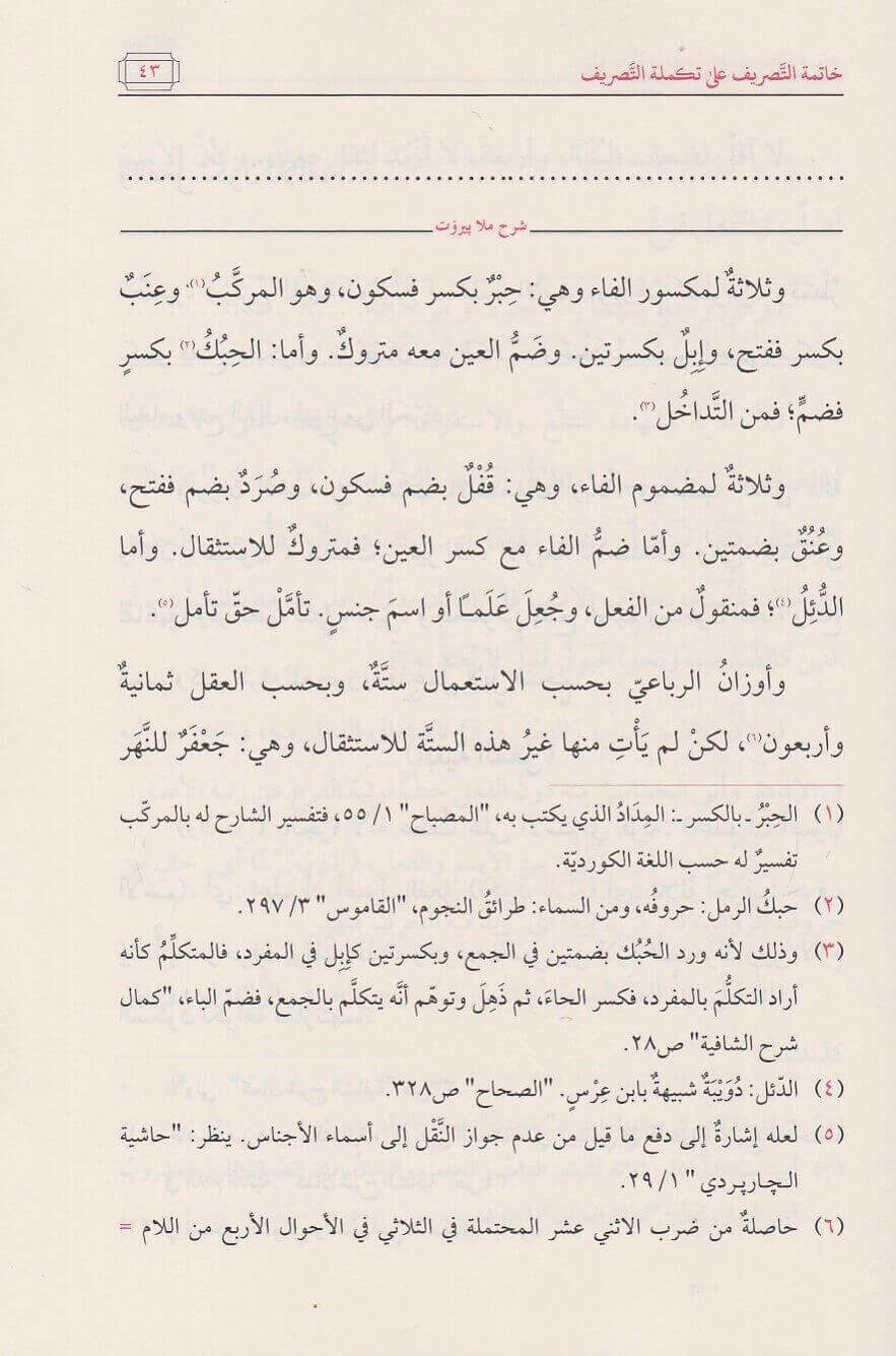 كتاب خاتمة التصريف هو أحد المؤلفات التعليمية في علم الصرف العربي، ويُعد مكملًا لكتاب "تكملة التصريف" المعروف بـ"تصريف ملا علي" يهدف الكتاب إلى تبسيط المفاهيم الصرفية وتوضيح القواعد المتعلقة بتصريف الأفعال والأسماء في اللغة العربية يُعد هذا الكتاب مناسبًا للطلاب والباحثين في مجال اللغة العربية، ويُستخدم كمرجع في المدارس والمعاهد الشرعية الكتاب يقع في عدد من الصفحات من القطع المتوسط، ومطبوع على ورق شاموا فاخر، مما يجعله ملائمًا للدراسة الأكاديمية والبحث العلمي