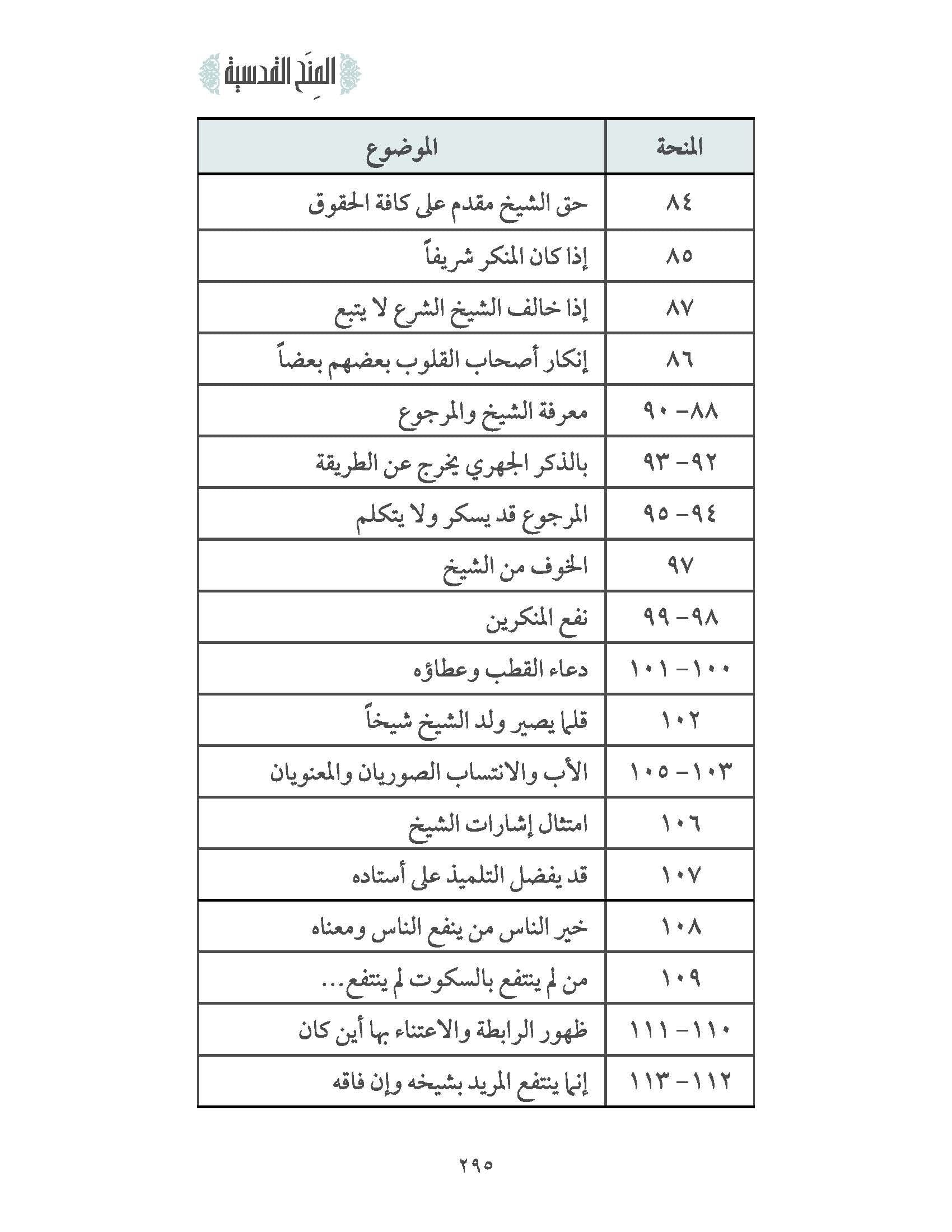 كتاب المنح القدسية يُعَد من الشروح الصوفية القيمة التي كُتبت على الحكم العطائية للإمام أحمد بن عطاء الله السكندري ويهدف هذا الكتاب إلى توضيح معاني الحكم وتبيين مضامينها الروحية والسلوكية بأسلوب يقرّب المعاني إلى قلوب المريدين والباحثين عن التزكية والصفاء الداخلي يعتمد الشارح على لغة صوفية نقية يجمع فيها بين الإشارة والعبارة ويُكثر من الاستشهاد بكلام أهل التصوف والعارفين بالله مما يجعل الكتاب مصدرًا غنيًا بالتجليات والمعارف كما يساعد القارئ على ربط المفاهيم النظرية بالسلوك العملي ويُعَد هذا العمل من الكتب التي يوصى بها في الحلقات والمجالس الصوفية وقد صدر عن دار الهاشمية في طبعة أنيقة تحتوي على 320 صفحة من القطع 17×24 سم مطبوعة على ورق شاموا ناعم ومجلدة تجليدًا متينًا يليق بقيمة المحتوى