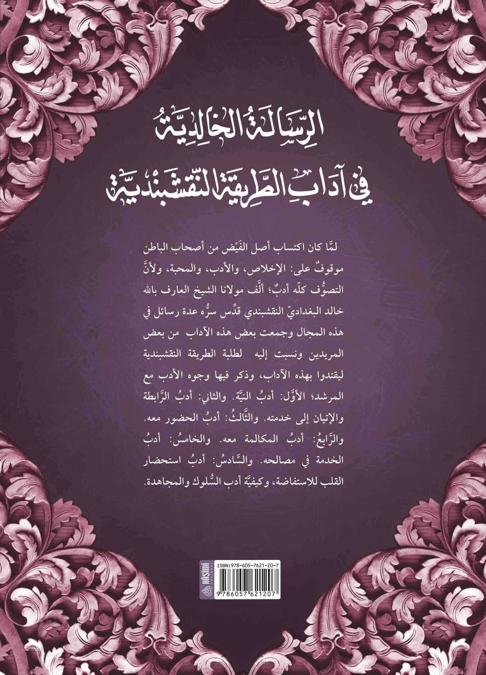 كتاب "الرسالة الخالدية في آداب الطريقة النقشبندية" هو مؤلف صوفي يعرض بأسلوب منهجي آداب السلوك في الطريقة النقشبندية، مع التركيز على المبادئ التربوية التي يجب أن يتحلى بها المريد في مسيرته الروحية. يتناول الكتاب موضوعات مثل النية، والربط القلبي (الرابطة)، وآداب مجالسة الشيخ، وخدمة المرشد، والإخلاص، والذكر، والمجاهدة، والسلوك. كما يسلط الضوء على أهمية التزام المريد بالآداب الظاهرة والباطنة لتحقيق القرب من الله. يُعد هذا الكتاب مرجعًا مهمًا للمريدين والمهتمين بالتصوف، حيث يقدم توجيهات عملية مستمدة من القرآن والسنة، ويعكس التجربة الروحية العميقة للمؤلف في الطريق النقشبندي.