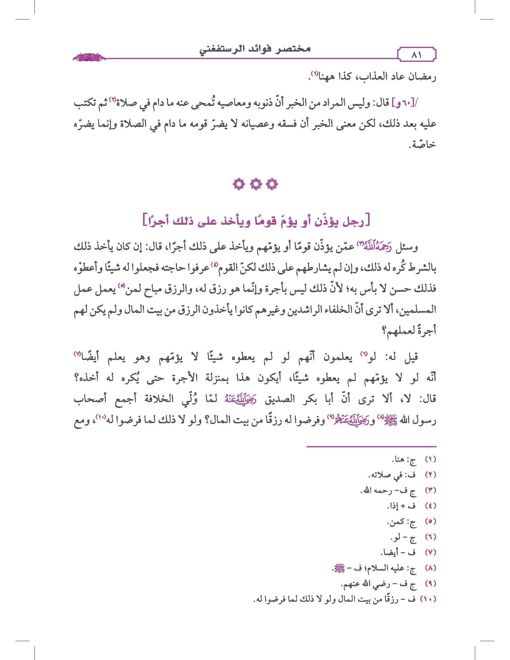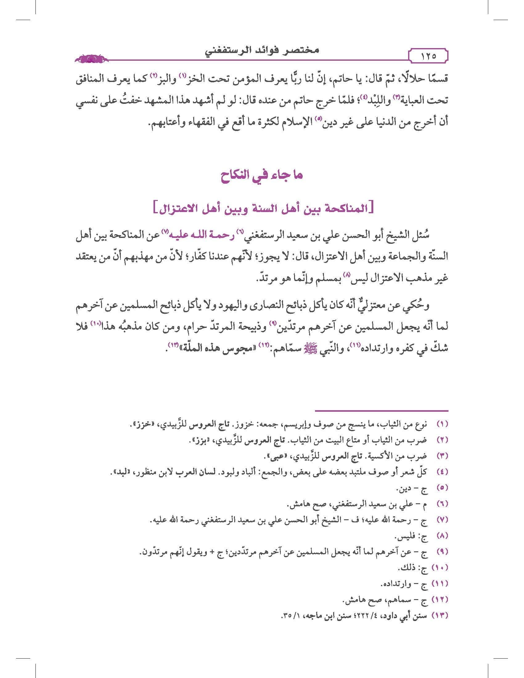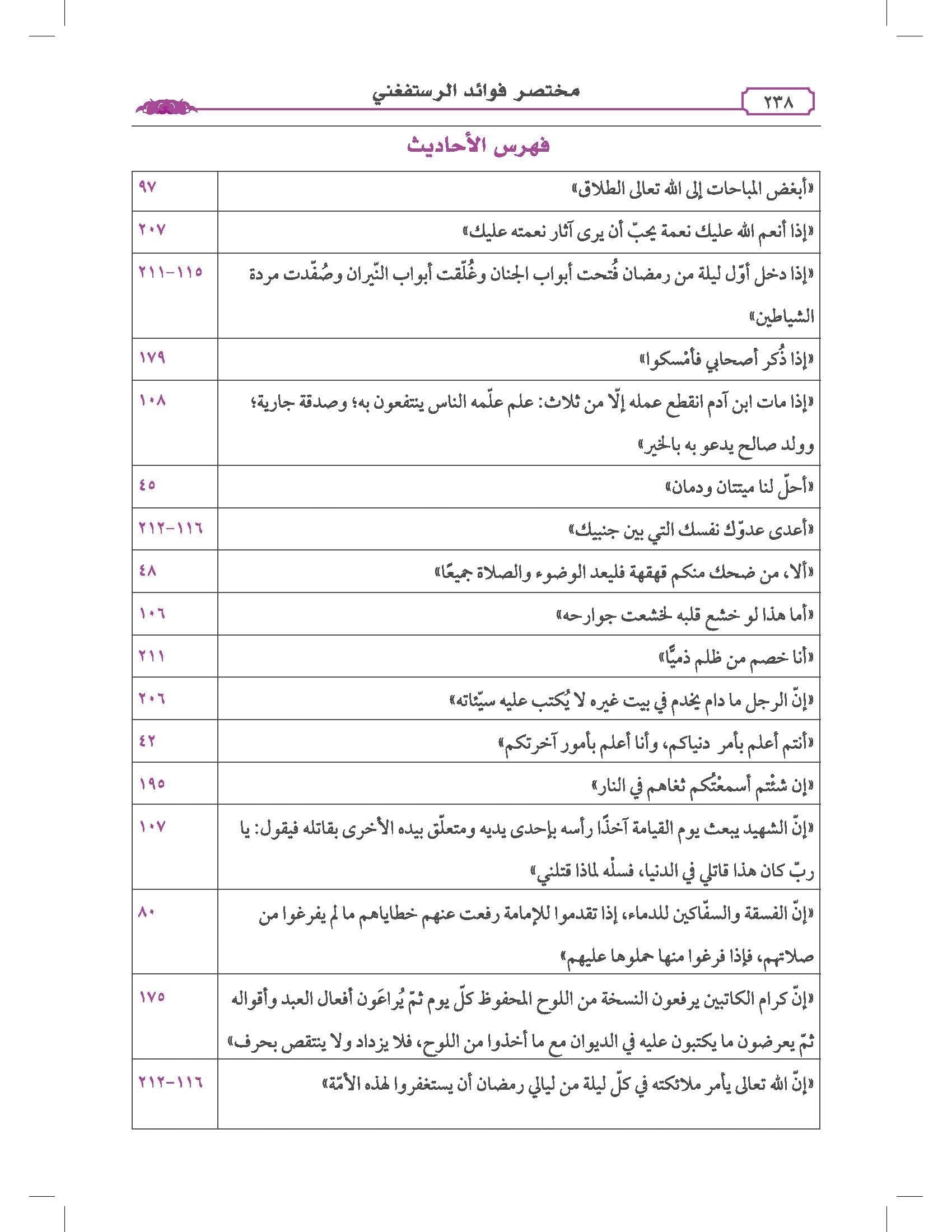 يُعد كتاب مختصر فوائد الرستفغني من المصنفات العلمية المختصرة التي تشتمل على خلاصة نافعة في علوم متعددة تخدم طالب العلم في مراحله الأولى والمتوسطة جمع فيه المؤلف أبو الحسن علي بن سعيد الرستفغني أهم المسائل والفوائد التي تدور حول الفقه والعقيدة والحديث والتفسير والسلوك بأسلوب مختصر وواضح يهدف إلى إيصال المعاني بأقرب طريق يتميز الكتاب بأنه لا يخوض في التطويل بل يقتصر على تقرير المسألة وفائدتها مع إشارة موجزة إلى مستندها العلمي مما يجعله سهل الفهم وسريع الاستيعاب وقد لقي هذا المختصر قبولًا في الأوساط العلمية خصوصًا في المدارس والمعاهد التي تدرس المتون التأسيسية لما فيه من تركيز على الأصول والقواعد المفيدة في فهم نصوص الشريعة وهو بذلك يُعد زادًا علميًا مباركًا لكل مبتدئ وجاد في طلب العلم الشرعي