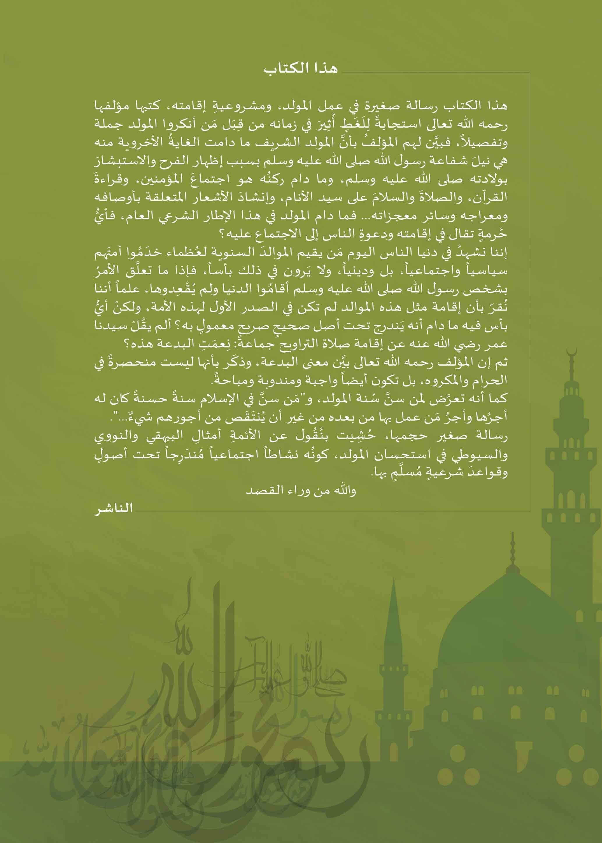 Bu eser, Peygamber Efendimiz'in (s.a.v.) doğumunu ve hayatını anlatan klasik bir metindir. Müellif, Mevlid-i Şerif'in manevi atmosferini ve Peygamberimizin örnek ahlakını edebi bir üslupla kaleme almıştır. Eser, Mevlid kandili gibi özel günlerde okunmak üzere tasarlanmış olup, okuyuculara derin bir manevi deneyim sunar. Arapça olarak yazılan bu kitap, hem bireysel okumalar hem de toplu etkinlikler için uygundur. Peygamber sevgisini pekiştirmek ve onun hayatını daha yakından tanımak isteyenler için değerli bir kaynaktır.