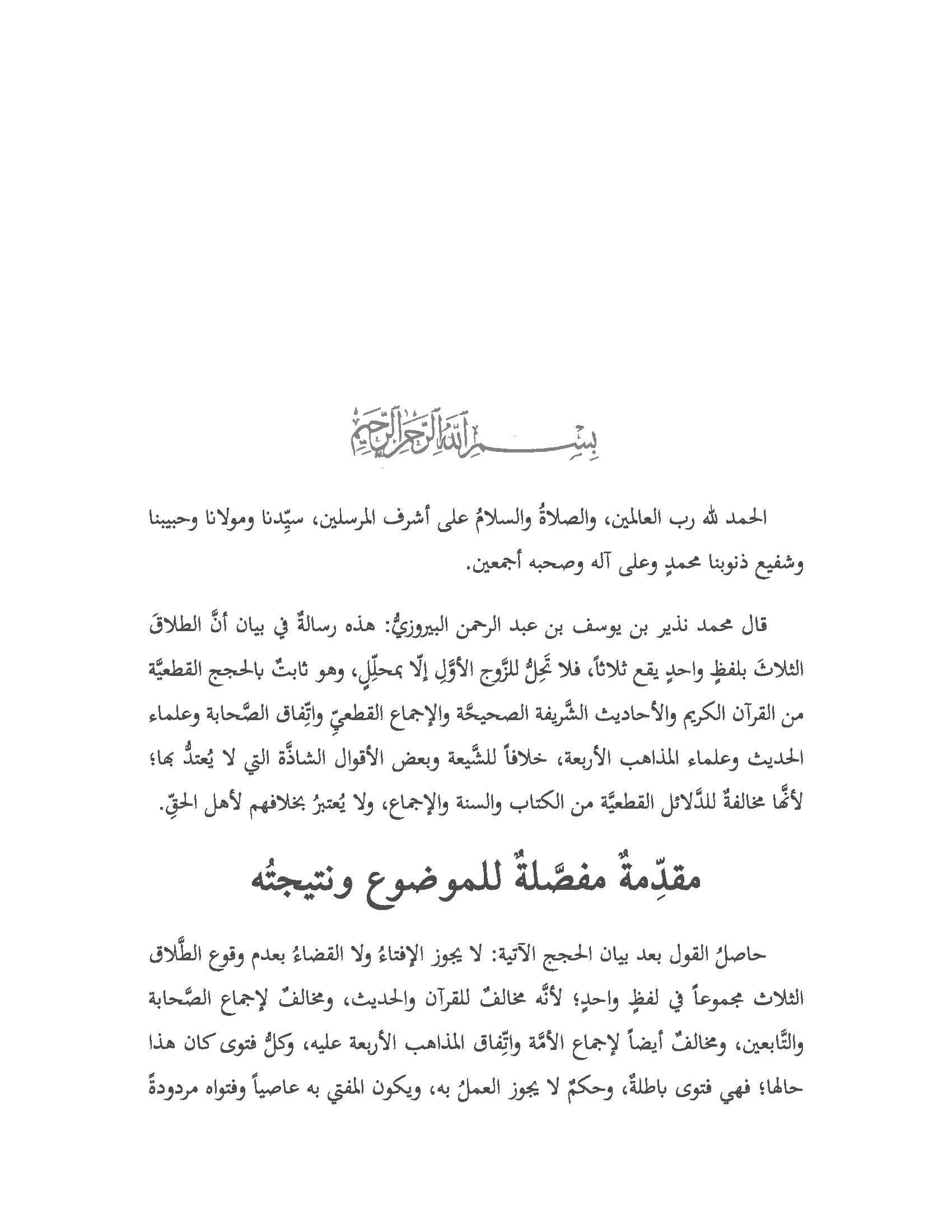 Bu eser, İmam Muhammed Takiyüddin b. Yusuf ed-Dinûrî tarafından kaleme alınmış ve özellikle bir mecliste üç talak lafzının üç boşamaya denk gelip gelmediği meselesini ele alan fıkhî bir risaledir Müellif bu konuyu mezhep imamlarının ve sahabe uygulamalarının ışığında değerlendirmiş ve üç ayrı lafzın üç boşama sayılacağı görüşünü savunmuştur Eserde deliller ayet ve hadislerle temellendirilmiş olup karşı görüşlere de ilmî cevaplar verilmiştir Kitap, günümüzde aile hukuku ve boşanma meseleleriyle ilgilenen medrese ve ilahiyat öğrencileri için önemli bir kaynaktır Açık ve anlaşılır bir üslup ile yazılmış bu eser, klasik fıkıh mirasını anlamak ve güncel meselelere ışık tutmak isteyenler için istifade edilecek niteliktedir