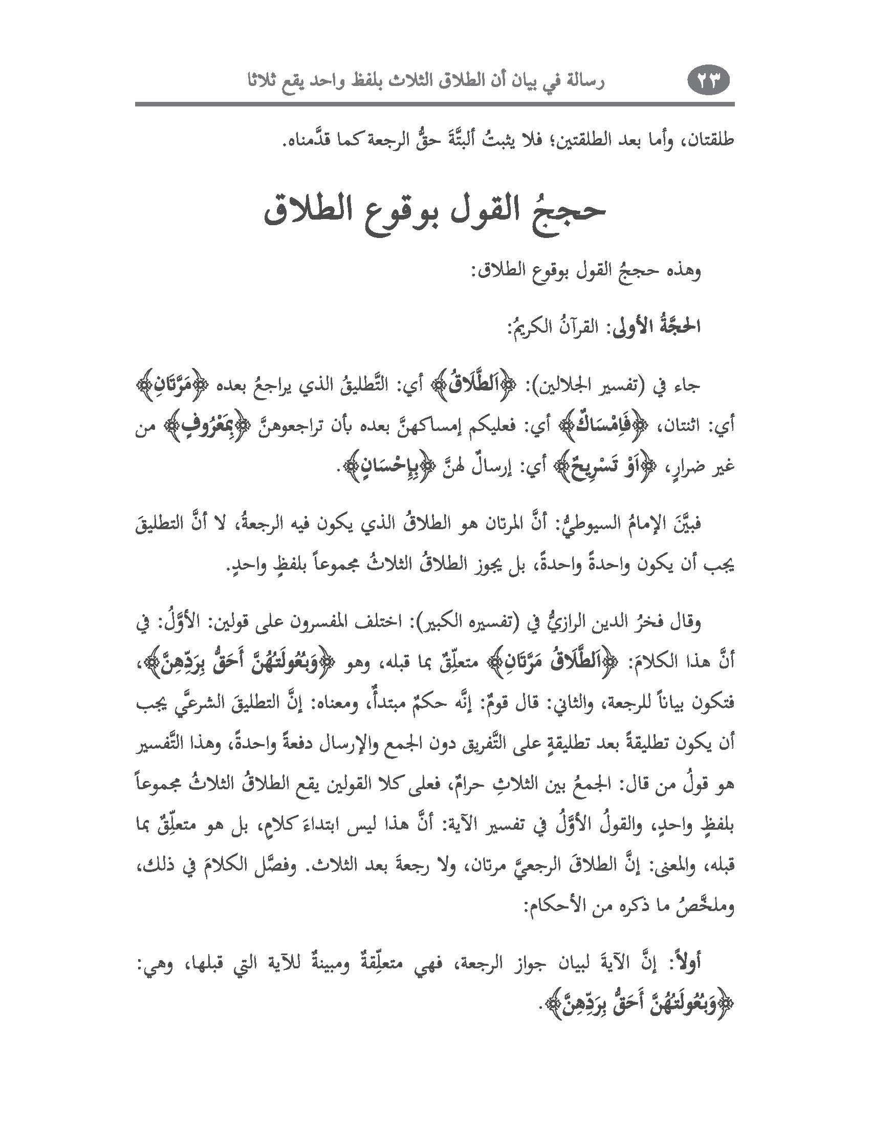 يُعد هذا الكتاب من الرسائل العلمية الفقهية التي ناقش فيها الإمام محمد تقي الدين بن يوسف الدينوري مسألة من أبرز مسائل الطلاق وهي حكم التلفظ بالطلاق ثلاثًا في مجلس واحد وهل يُحسب ثلاثًا أم واحدة عالج المؤلف المسألة بأسلوب علمي دقيق مستندًا إلى أقوال السلف وأدلة الكتاب والسنة وآثار الصحابة والتابعين فبيّن أن قول الرجل لزوجته أنتِ طالق طالق طالق أو أنتِ طالق ثلاثًا يقع ثلاث تطليقات لا واحدة كما ذهب إليه بعض المعاصرين هذا الكتاب ليس مجرد فتوى بل دراسة منهجية تتناول أدلة القول وترد على الإشكالات المثارة حوله ويُعد مرجعًا مهمًا في علم الفقه المقارن وخصوصًا في باب الطلاق ويُناسب طلاب العلم الشرعي والباحثين في قضايا الأحوال الشخصية والفتوى المعاصرة